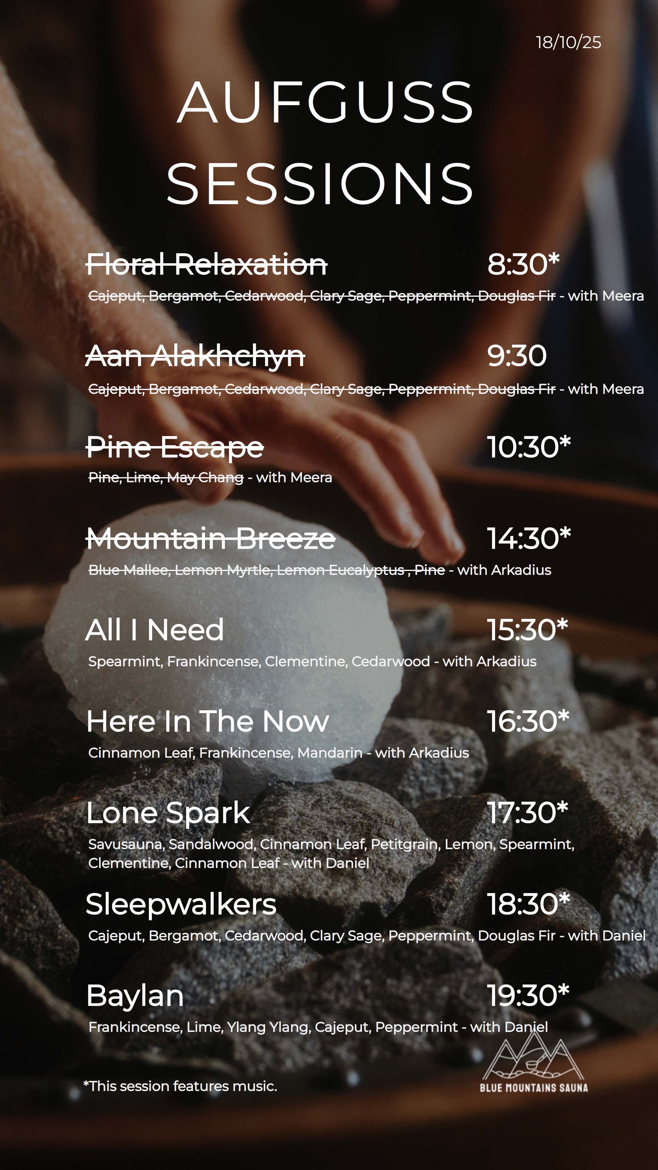 Infusion Playlists Uncategorized / By bmsauna 8:30 – Floral Relaxation Playlist 9:30 – Aan Alakhchyn Playlist 10:30 – Pine Escape Playlist 14:30 – Mountain Breeze Playlist 15:30 – All I Need Playlist 16:30 – Here In The Now Playlist 17:30 – Lone Spark Playlist 18:30 – Sleepwalkers Playlist